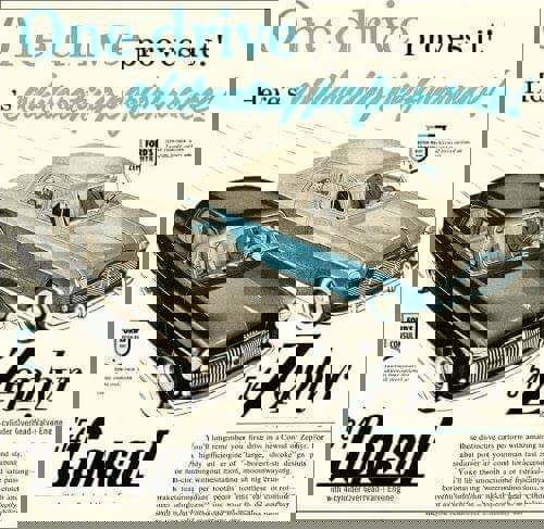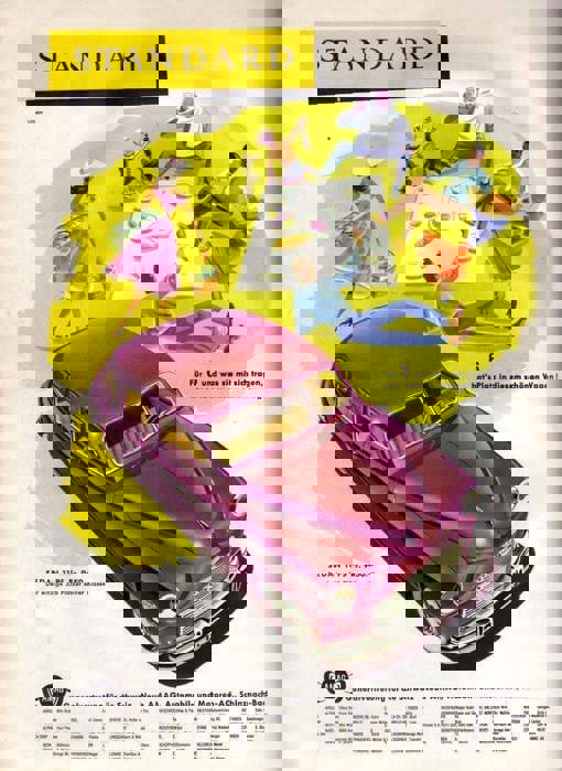 Det er fasinerende å se hvordan reklamene har forandret seg fra 50-tallet og frem til tidlig på 80-tallet. I begynnelsen var reklamen oftest håndtegnet og i sort/hvitt eller håndkolorert. Bilene var ofte tegnet med feil proporsjoner slik at kunden fikk inntrykk av at hele bilen, kupeen eller bagasjerommet var langt mer romslig enn hva det var i virkeligheten. Motivene var fra "livets gode sider" som f.eks . på en picnic, langs en idyllisk landevei eller utenfor et flott hotell.